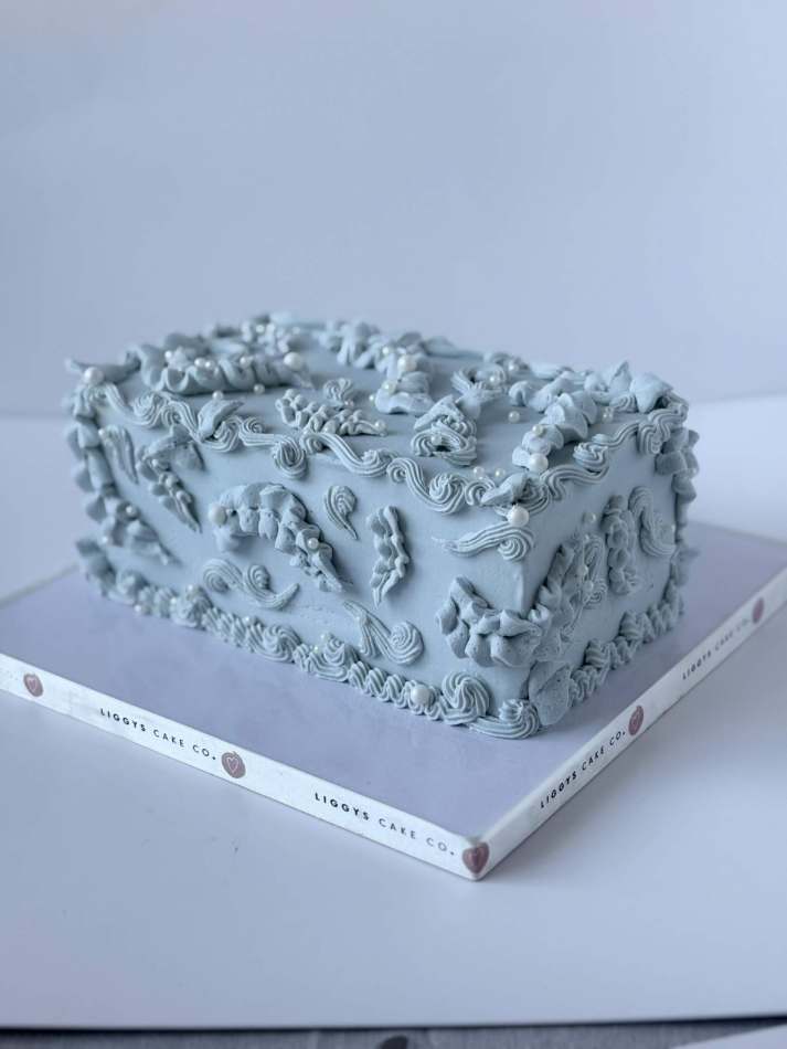 Baby Blue Rectangle Cake. Two delicious layers of sponge cake with a filling of your choice covered in soft blue buttercream. The cake can be finished with a hand piped message on the cake board if required.