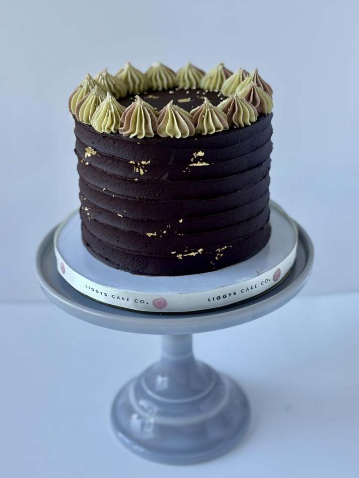Our take on the 'Dubai Chocolate' trend! Layers of chocolate sponge filled with a rich chocolate buttercream filling and a pistachio creme. Covered in chocolate buttercream and decorated with pistachio buttercream piping.