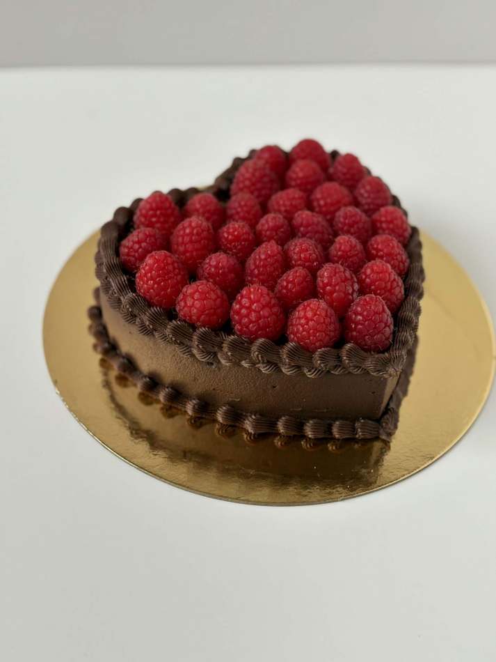 Chocolate Raspberry Heart Cake. Perfect for 2 to share, this 6" chocolate sponge heart cake is filled with chocolate buttercream and topped with a heart of fresh raspberries.
