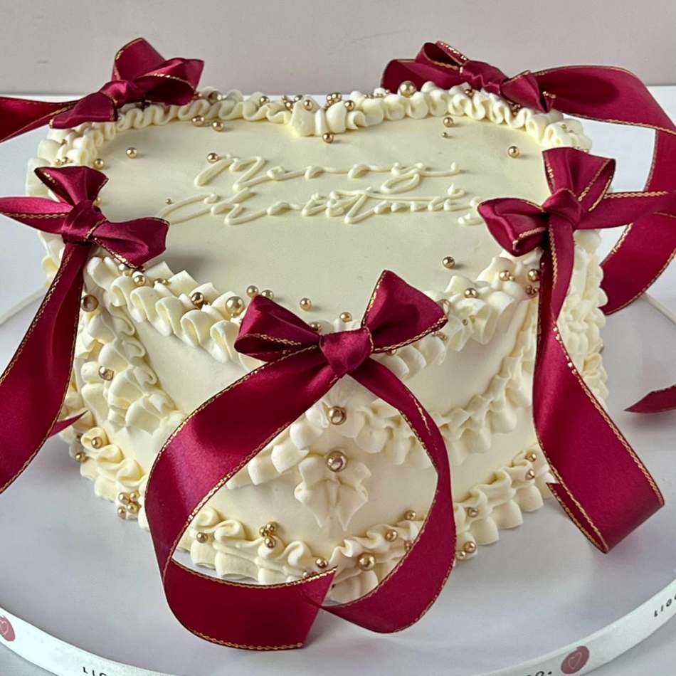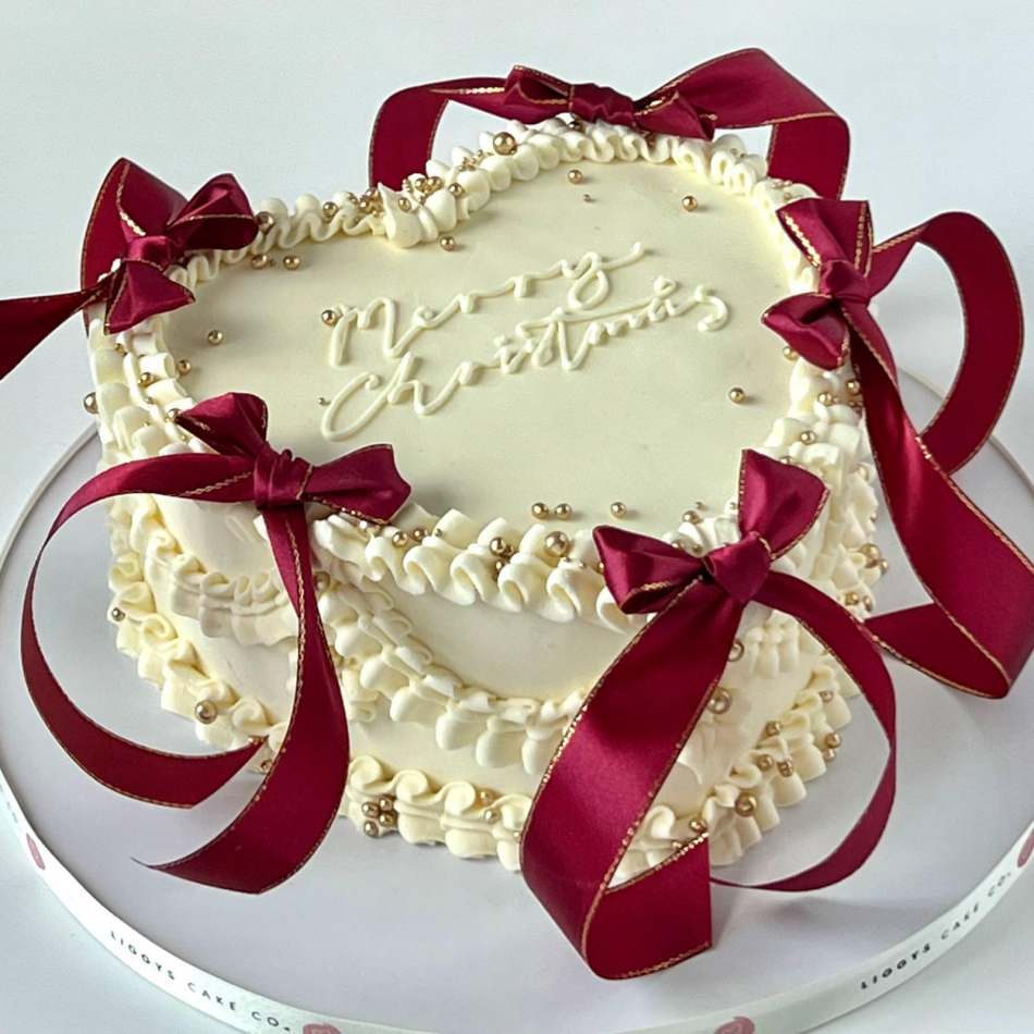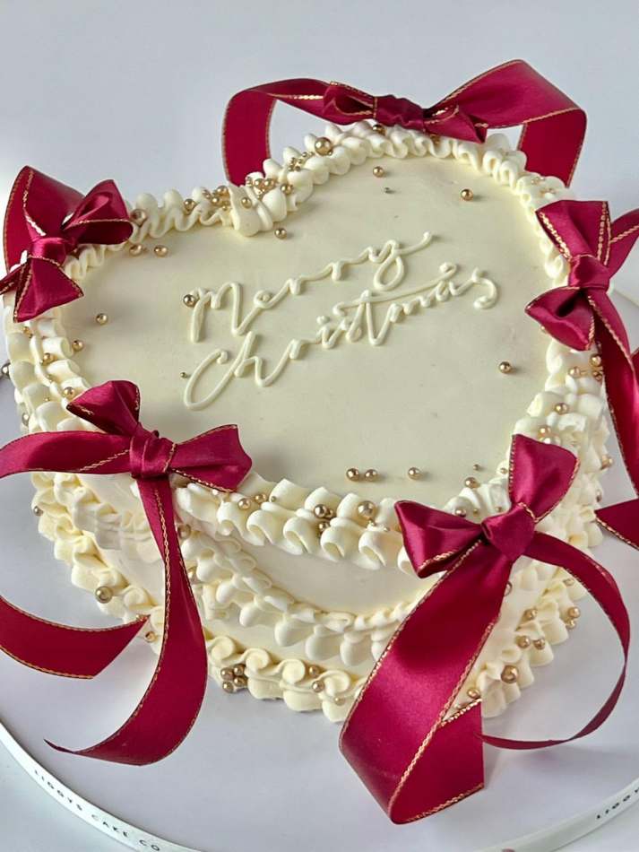 Christmas Retro Bows Cake. Two layers of sponge finished with delicate retro piping and oversized Christmas bows.