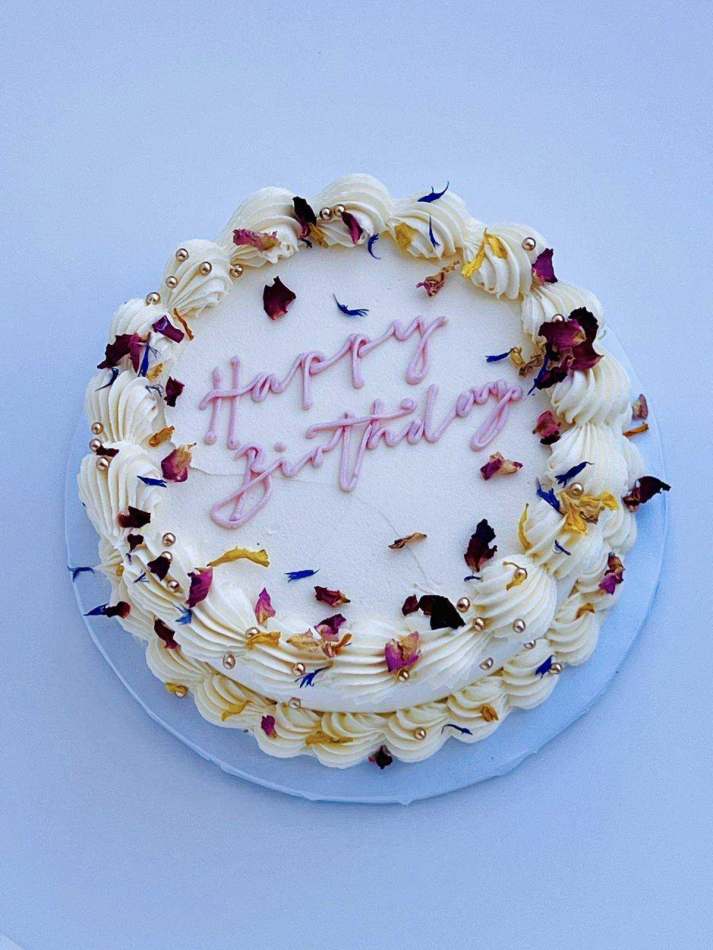 A two layer sponge cake of your choice filled and finished with delicate shell piping and a personal message. Finished with gold sprinkles and colourful edible petal confetti.
