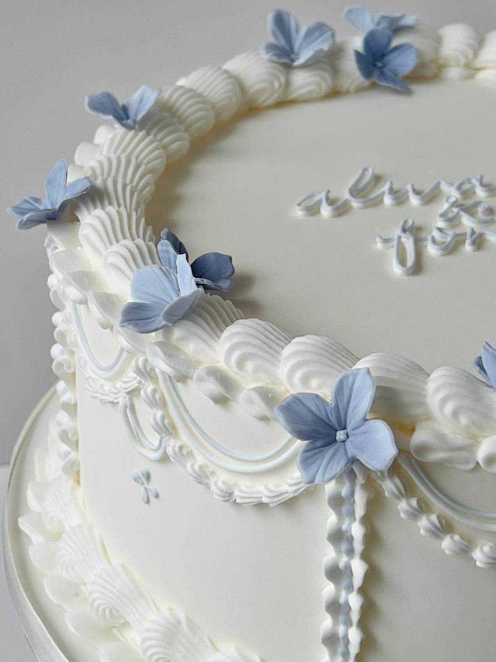 A pretty design decorated with fondant and finished with delicate sugar cornflowers and intricate hand piped detailing.