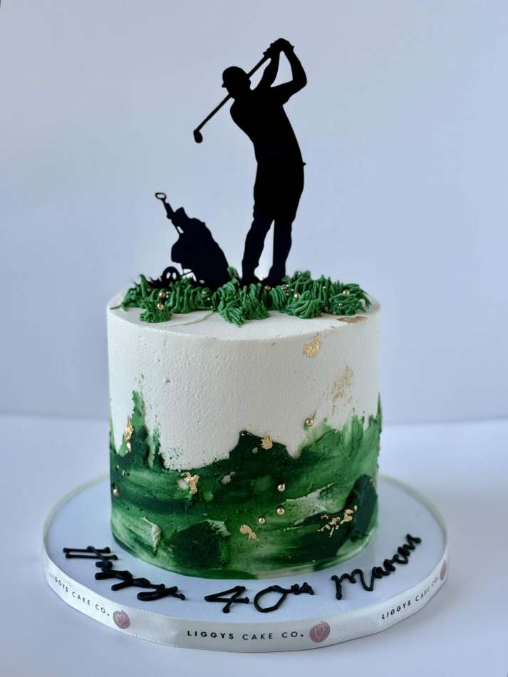 3 layers of delicious sponge finished with marbled buttercream, edible gold leaf flecks and a non edible golfer and golf bag topper. Can be finished with a hand piped personalised message.
