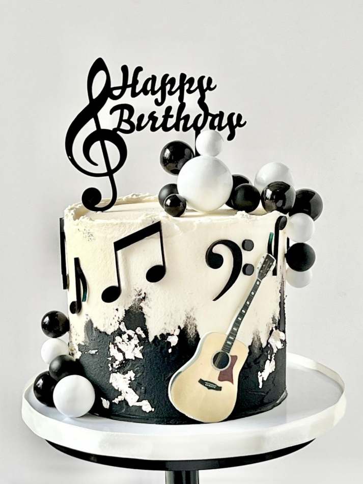 For the budding musicians! 3 layers of sponge cake finished with black buttercream detailing, edible silver leaf and non edible monochrome 'balloons', musical notes and a cake topper.