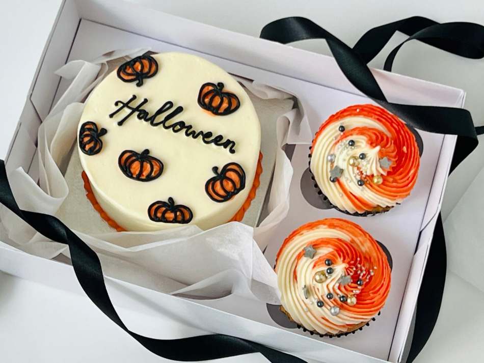 A wickedly cute pumpkin bento box with two cupcakes perfect as a halloween gift!
