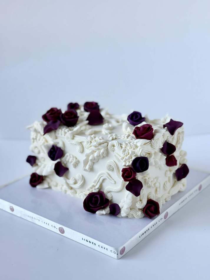 Show someone you love them with this elegant and modern take on a romantic celebration cake! Iced in buttercream and finished with handmade sugar roses and petals. We can add a hand piped personal message to the cake board if required.