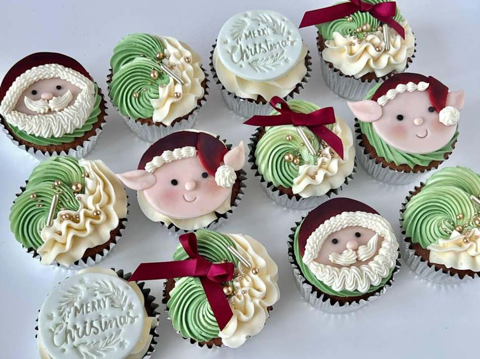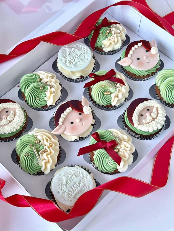 Santa and His Elves Cupcakes Box of 12. 12 delicious cupcakes finished with Santa faces and Elves and festive green buttercream swirls and a Merry Christmas message