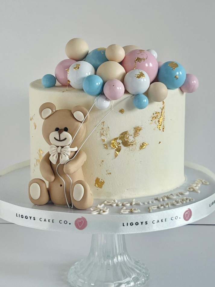 A 3 layer buttercream sponge cake in a flavour of your choice finished a handmade sugar teddy with non edible balloons and finished with gold leaf.