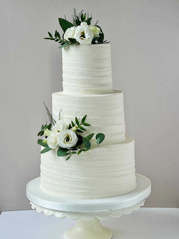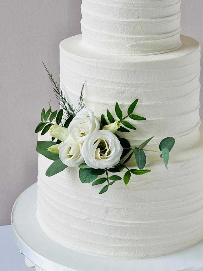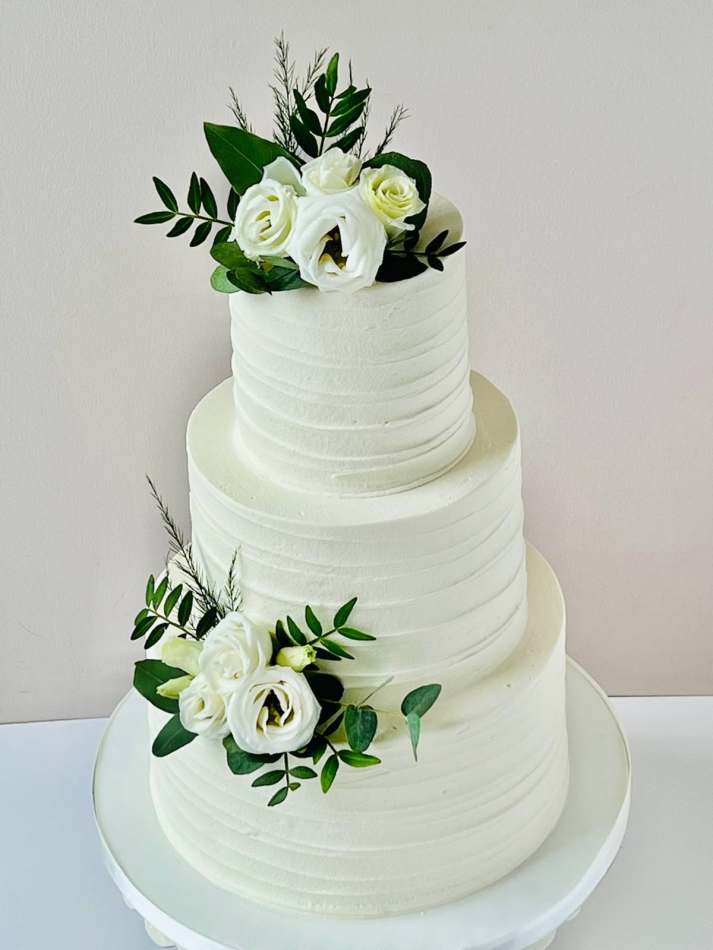 Three delicious tiers of sponge cake finished with fresh buttercream and decorated with fresh white seasonal florals and foliage. The cake is supplied with flowers but please let us know if you would prefer your own florist to dress the cake. Available for delivery or collection.