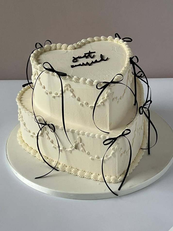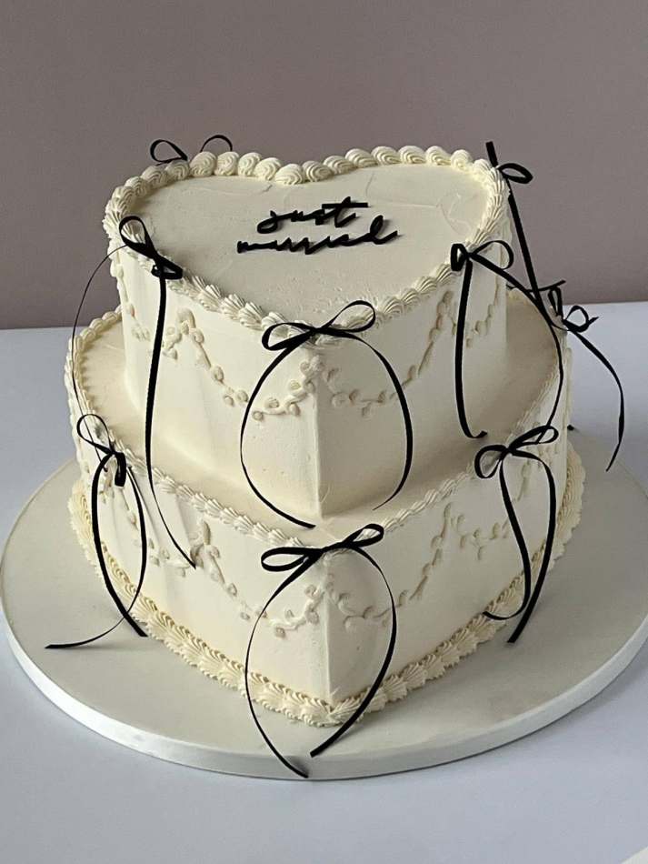 Two Tier Black Bows Wedding Cake. A beautiful 2 tier heart cake finished with delicate shell piping and decorative black bows.