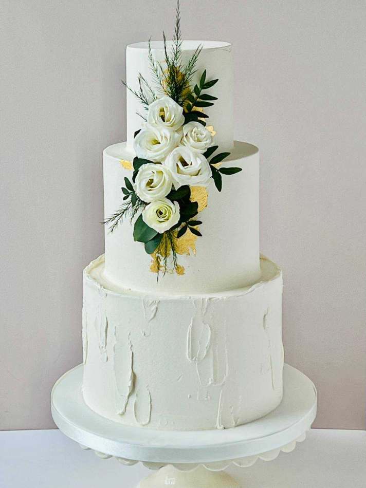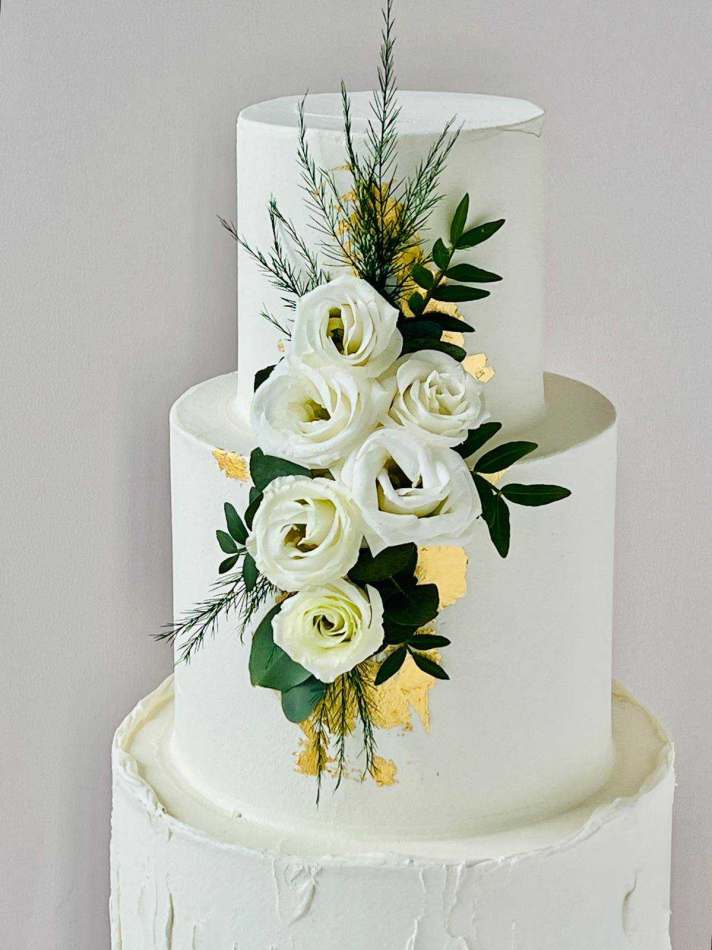 White floral buttercream cake with Gold Leaf. Three tiers of sponge cake finished with fresh florals, foliage and edible gold leaf. The cake is supplied with flowers but please let us know if you would prefer your own florist to dress the cake. Available for delivery or collection.