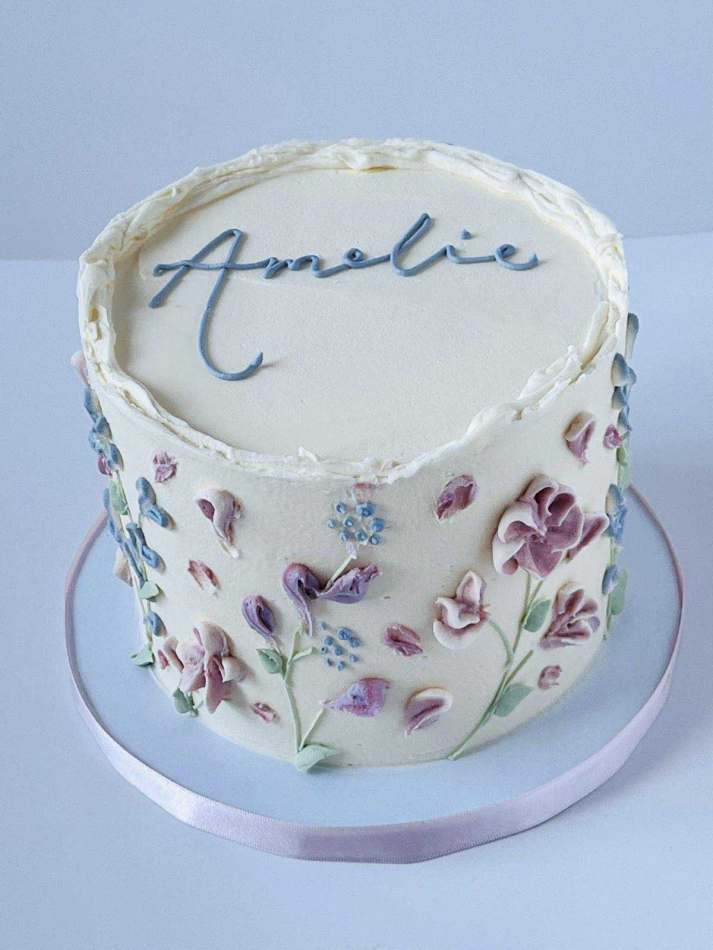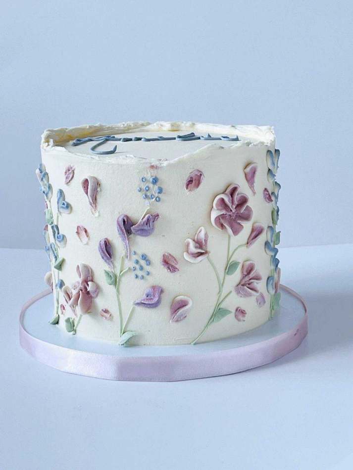 The prettiest of celebration cakes iced in ivory buttercream and decorated with delicate hand piped buttercream flowers in lilacs, blues and lavender tones. The cake is finished with a hand piped message.